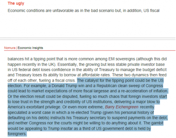 而达到上述临界点的一个催化剂就是美国大选。例如,特朗普获胜、共和党横扫国会可能导致市场预期出现更多的财政刺激,且通胀再次加剧。又或者是,选举结果存在争议,引发混乱,以至于外国投资者开始对美国机构的实力和信誉失去信任。