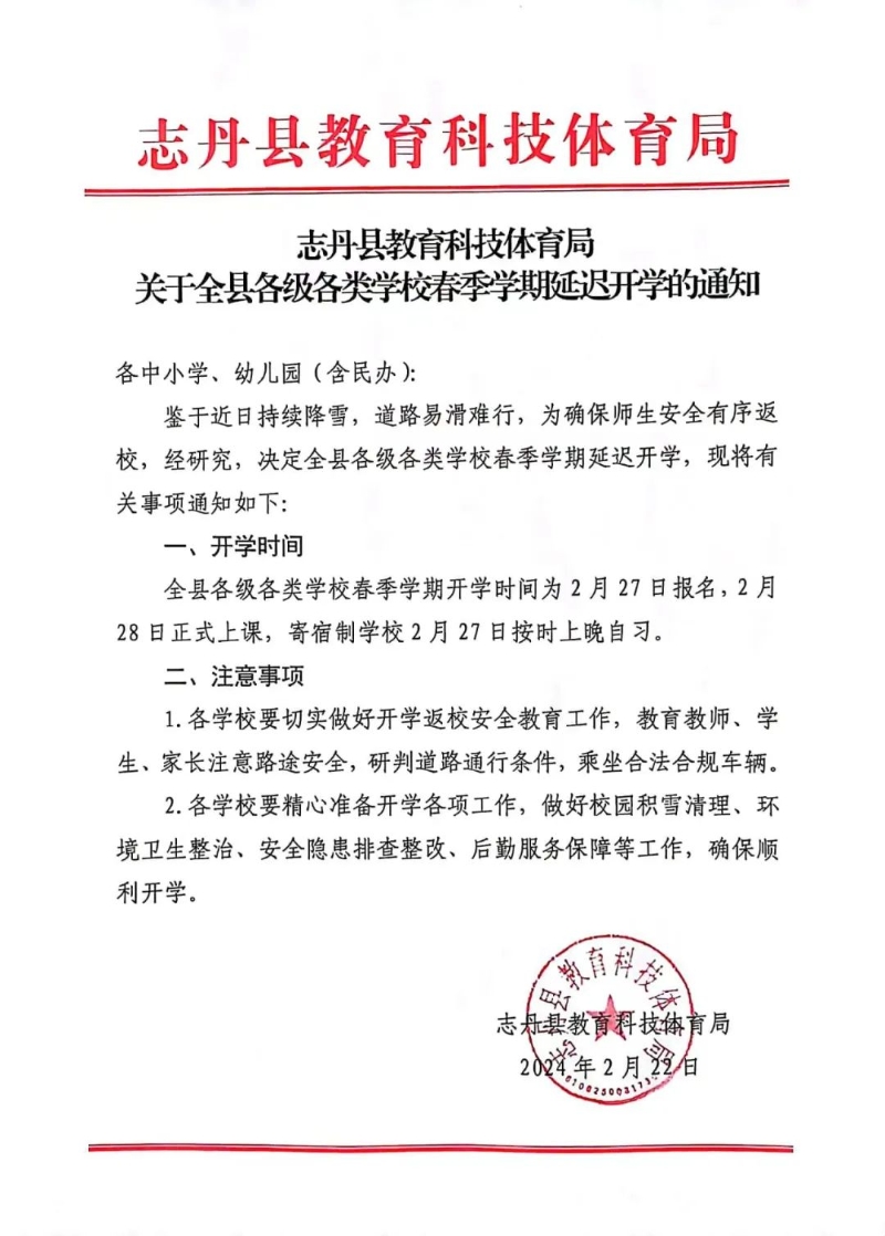2月22日,延安市志丹县教育局发布通知,全县各级各类学校春季学期延迟开学,通知中提到:鉴于近日持续降雪,道路易滑难行,为确保师生安全有序返校,经研究,决定全县各级各类学校春季学期延迟开学。开学时间:全县各级各类学校春季学期开学时间为2月27日报名,2月28日正式上课,寄宿制学校2月27日按时上晚自习。