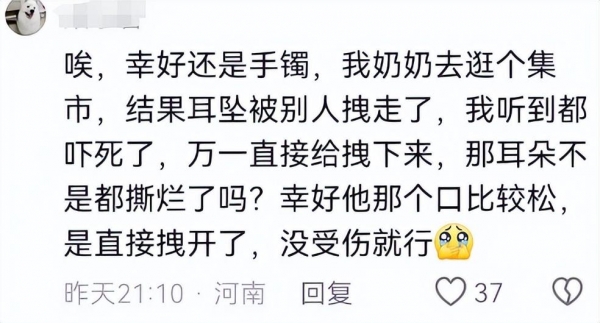 奶奶逛个市集,耳坠被拽走了。