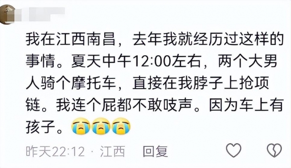 两个骑摩托车的大男人,抢了我脖子上的项链,我却不敢吱声,因为有小孩。