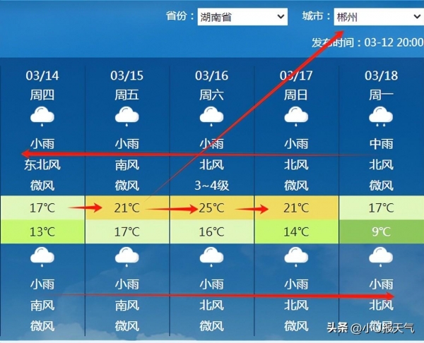 像永州、郴州、衡阳等地,出现一边下雨、一边升温的天气,最高气温在20℃+。