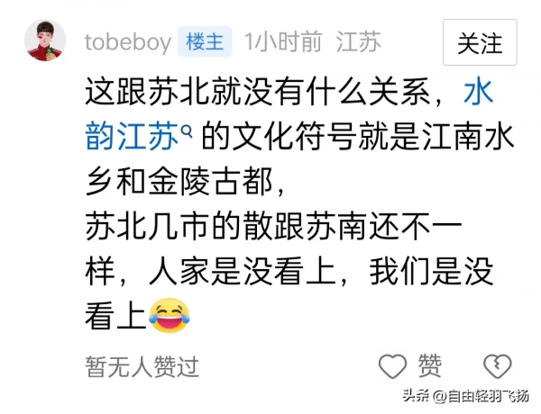 网友回复道:这跟苏北就没有什么关系,水韵江苏的文化符号就是江南水乡和金陵古都,苏北几市的散跟苏南还不一样,人家是没看上,我们是没看上。