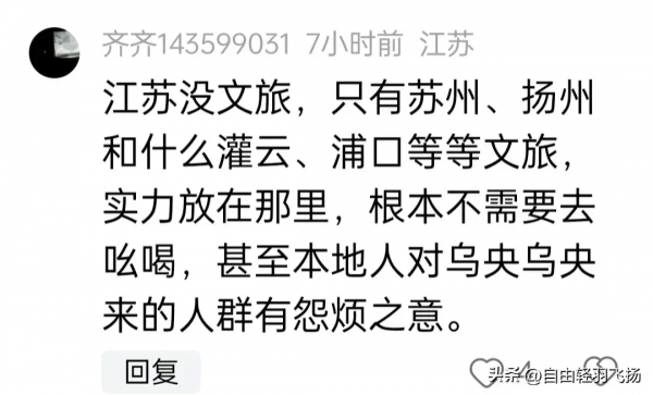 有网友说:江苏没文旅,只有苏州、扬州和什么灌云、浦口等等文旅,实力放在那里,根本不需要去吆喝,甚至本地人对乌央乌央来的人群有怨烦之意。