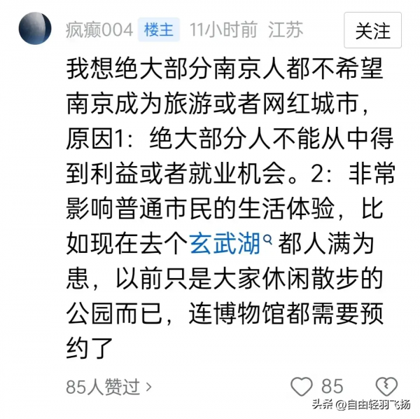 南京网友回复:我想绝大部分南京人都不希望南京成为旅游或者网红城市,原因1:绝大部分人不能从中得到利益或者就业机会。2:非常影响普通市民的生活体验,比如现在去个玄武湖都人满为患,以前只是大家休闲散步的公园而已,连博物馆都需要预约了。