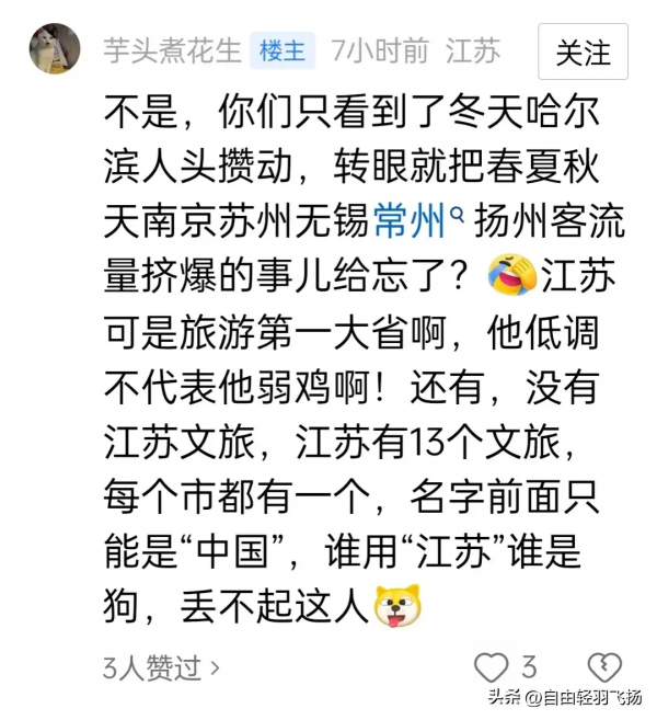 网友表示,江苏有上13个文旅:不是,你们只看到了冬天哈尔滨人头攒动,转眼就把春夏秋天南京苏州无锡常州扬州客流量挤爆的事儿给忘了?江苏可是旅游第一大省啊,他低调不代表他弱鸡啊!还有,没有江苏文旅,江苏有13个文旅,每个市都有一个,名字前面只能是"中国",谁用"江苏"谁是狗,丢不起这人!