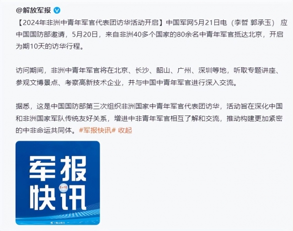 除了我们和南非的军事互动之外,5月20日当天,还有来自非洲40多个国家的80余名中青年军官抵达北京,他们将在中国进行为期10天的访华行程。这已经是中国国防部第三次组织非洲国家中青年军官代表团访华交流。