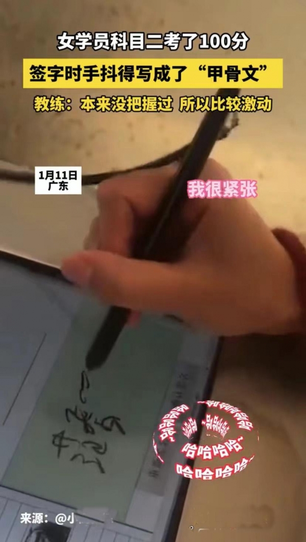 女子科目二考100分 签字时签成"甲骨文"