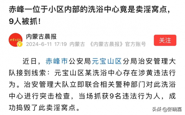 "小区洗浴中心竟是卖淫窝点,9 人被抓!"赤峰市,洗浴中心挂羊头卖狗肉,表面是洗澡的,但里面却另有乾坤,藏匿着一个色情交易场所!只要你有钱,失足女就能提供各种有偿服务,包你舒服!但有正义人士看不下去,向警方举报了!