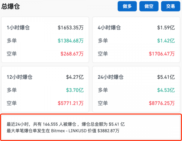 据CoinGlass数据显示,最近24个小时内,虚拟货币市场共有16.6万投资者爆仓,爆仓总金额达5.41亿美元(约合人民币39亿元)。