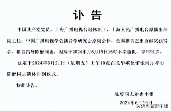 91岁高龄,依然活跃在播音一线,这份传奇,只有陈醇做得到!没想到,6月19日这天,老先生竟然因为突发心脏衰竭,就这么悄悄地离开了这个世界。消息一出,多位知名主持人纷纷发文悼念。这个熟悉的声音,伴随了几代上海人,如今却再也听不到了。那么,陈醇的播音生涯中,还有哪些鲜为人知的故事呢?