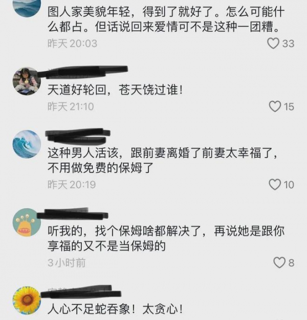 还有网友说,有些男人就是这样,在原配面前啥都不干,像个大爷一样,家里油壶倒了都不会去扶起来。娶个二婚老婆,喊他干啥,都去干。这就是报应啊。