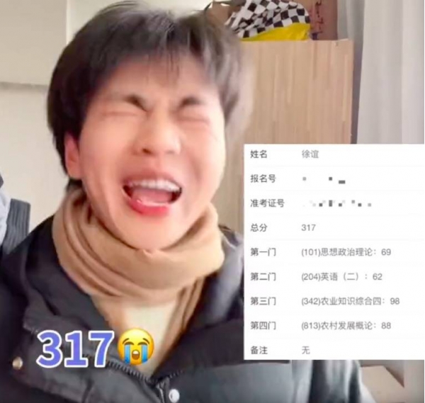 在点开查询入口后,小徐眼泪夺眶而出,随后兴奋跳了起来,"317!我不哭,我有什么可哭的,我高兴啊!政治考了69,英语居然考了62。我是农学,总共考了317分,我们去年最低线是292分,国家线是251分。"
