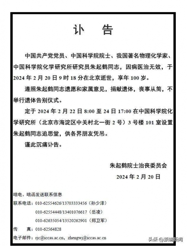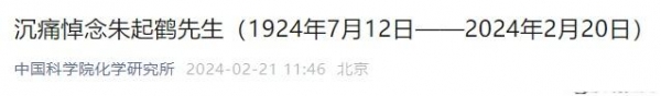 2月21日,中国科学院化学研究所发布讣告,中国科学院院士、我国著名物理化学家、中国科学院化学研究所研究员朱起鹤,因病医治无效,于2024年2月20日在北京逝世,享年100岁。
