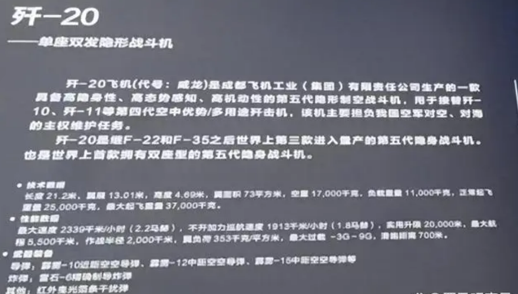 这个是歼20战斗机实力介绍的展板,从上面能看到几个关键的信息。