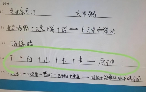 在阅卷过程中,我们有幸看到了一些学生的试卷,其中一个学生在回答问题时故意将"原神"这两个字拆分开来作答。这看似调皮的举动可能是出于对考试难度的挑战,或者是因为他实在难以找到正确答案。