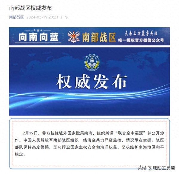 南部战区除夕夜官宣巡航消息至今令人难忘,随时备战、随时能战、随时胜战的精神更是令人鼓舞,虽然美菲持续在南海制造事端,但是一切尽在掌握,战区部队全时保持高度戒备,坚决捍卫国家主权安全和海洋权益,我们倒是不用担心。
