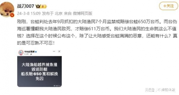 对此,微博粉丝超130万的军事大V博主@战刀007 怒斥:"台判去年9月抓扣的大陆渔民7个月监禁或赔偿650万台币。而台伪海巡署撞翻我大陆渔民致死,才赔偿611万台币。我们大陆渔民的生命就这么不值钱?选择在这个时候公布这个,除了让大陆感受满满的恶意,还能有什么?真的是可忍孰不可忍!"