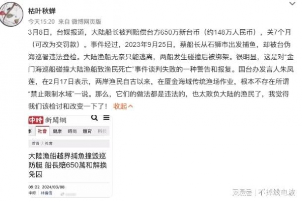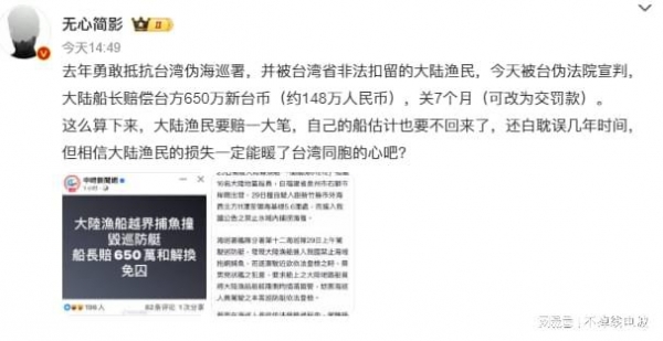 近150万粉丝的知名博主@无心简影也表示:"大陆渔民要赔一大笔,自己的船估计也要不回来了,还白耽误几年时间,但相信大陆渔民的损失一定能暖了台湾同胞的心吧?"