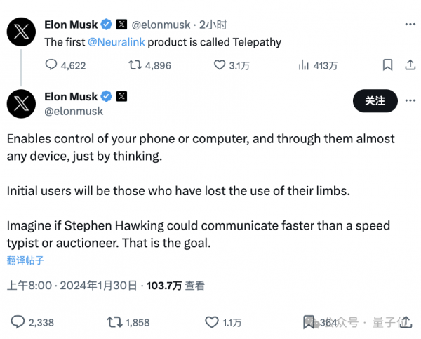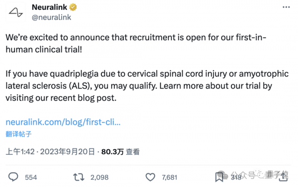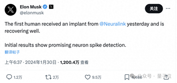 第一个人已于昨天接受了@Neuralink的植入物并且恢复良好。