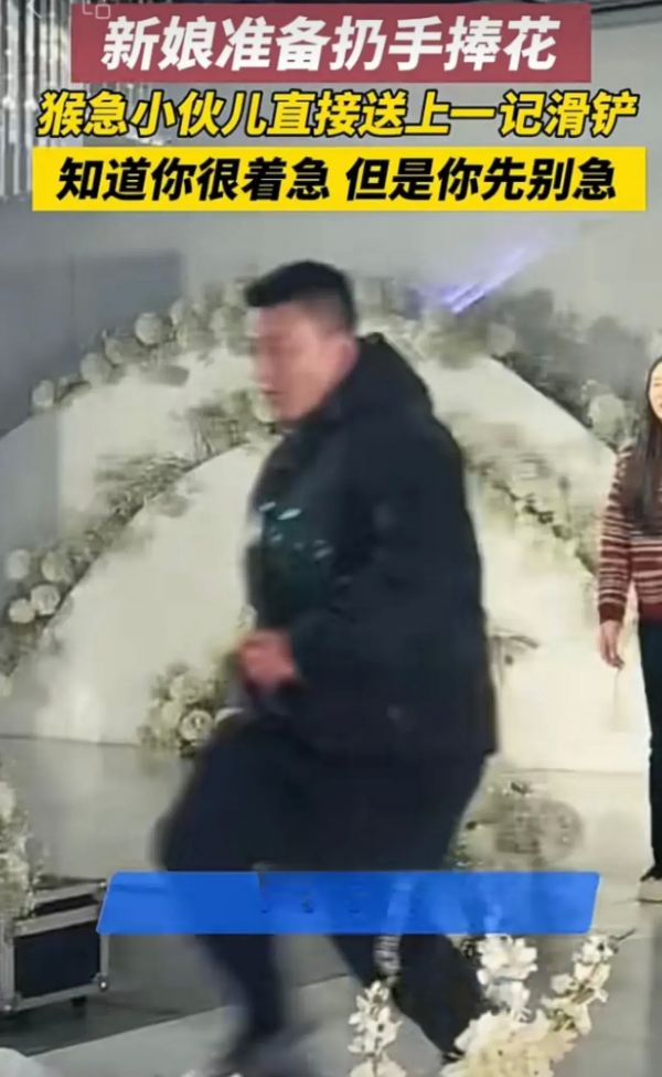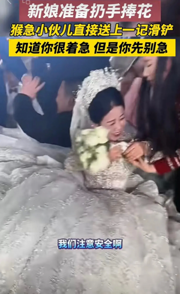 山东一新娘准备扔手捧花,结果猴急小伙儿一个助跑铲倒新人,场面社死!
