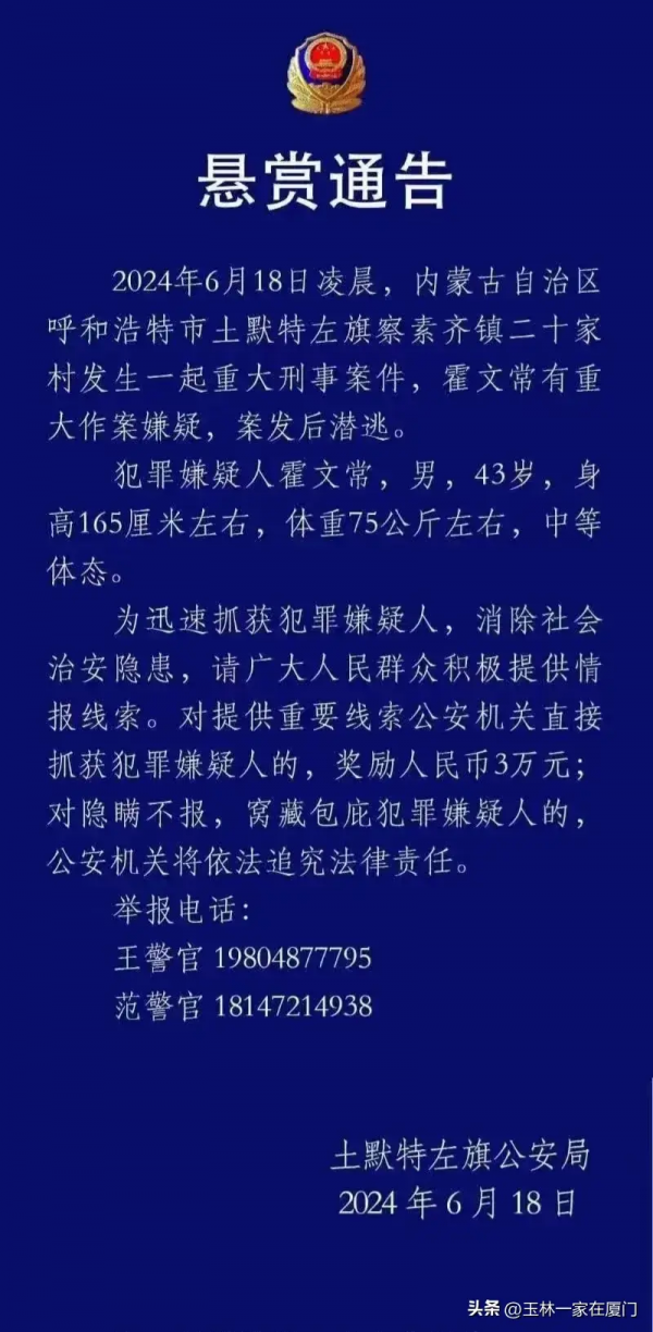 2024年6月18凌晨,内蒙古自治区呼和浩特市,土默特左旗察素齐镇二十家村发生一起重大刑事案件,霍文常在逃!