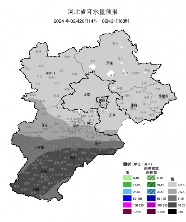 根据河北省142个气象站数据统计2月19日20时至20日11时张家口、保定、廊坊南部、石家庄、沧州、衡水、邢台、邯郸出现雨雪天气,共74个气象站迎来降水,降水区平均降水量为1毫米,深泽降水量最大为3.4毫米,石家庄主城区降水量为2.1毫米。