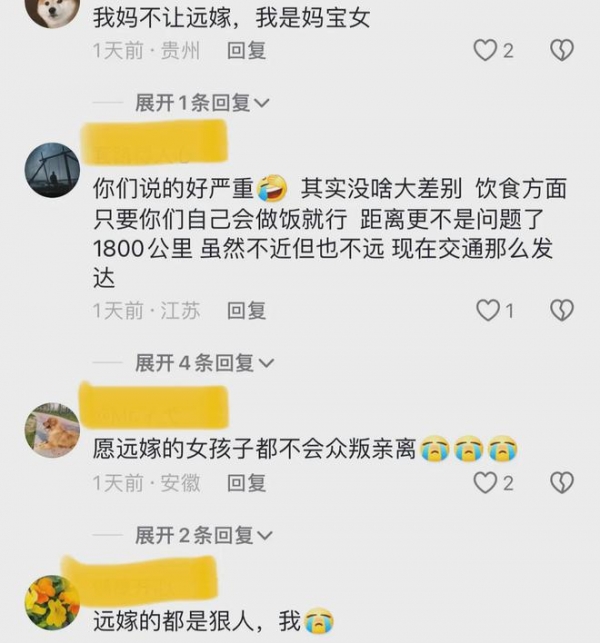 甚至有网友说,我就是远嫁,你现在后悔还来得及。我肠子都悔青了。过年回家,来回就是很大一笔支出,而且根本买不到票。好几年没有回娘家了,和家人的关系越来越生疏。感觉父母白生了我。