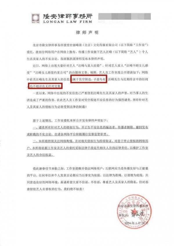 然而,就在大家纷纷猜测这些爆料是真是假时,1月26日,汪峰工作室站出来发声明辟谣。声明中明确表示:"网络中有关汪峰先生及其家人的信息均属于凭空捏造、子虚乌有。汪峰先生与近期传言中的任何人均不相识也无任何交集。"看来这次爆料真的是空穴来风了。