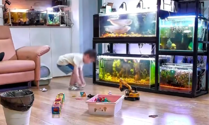 小孩视角大概率是,一条鱼从鱼缸里出来了直奔自己而来,吓死他了