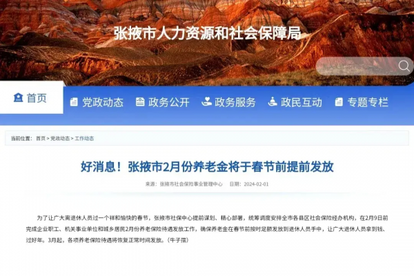 甘肃张掖市居民和职工养老金提前到2月9日前发放。