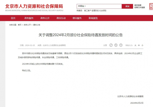 北京明确,原定于2月15日发放的养老金提前到2月8日发放,除了养老金外,工伤和失业保险待遇也一并提前到8日发放。