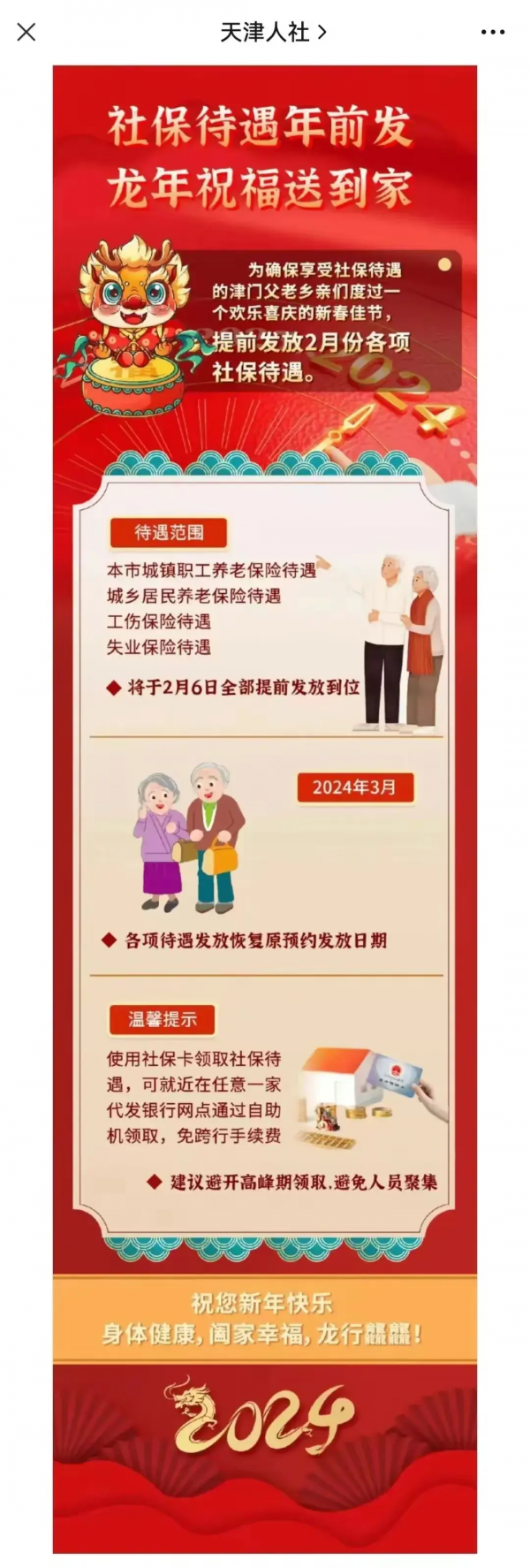 天津人社在微信公众号上发布消息,明确2月份养老金将在2月6日发放。