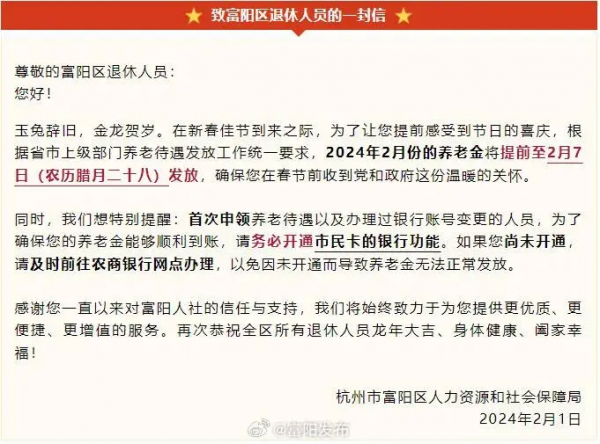 杭州市富阳区退休人员养老金将提前到2月7日发放。