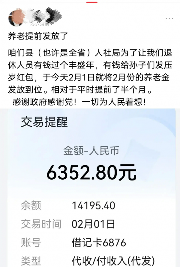 原定于2月10日发放的城乡居民养老金提前到2月6日发放,原定于9日到14日发放的职工养老金,提前到2月6日发放,原定于2月15日到25日发放的职工养老金,提前到2月7日发放。