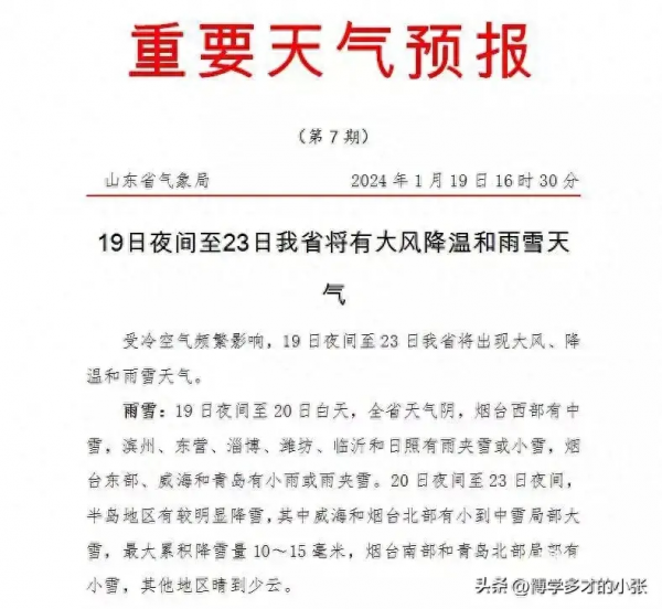 据了解,未来五天山东地区都将受到大风降温和雨雪天气的影响,所以大家一定要做好防寒保暖工作。多穿几件衣服,多喝热水,坚持锻炼身体,提高抵抗力。同时,对于老人和儿童来说,更要格外关注,确保他们的身体健康。