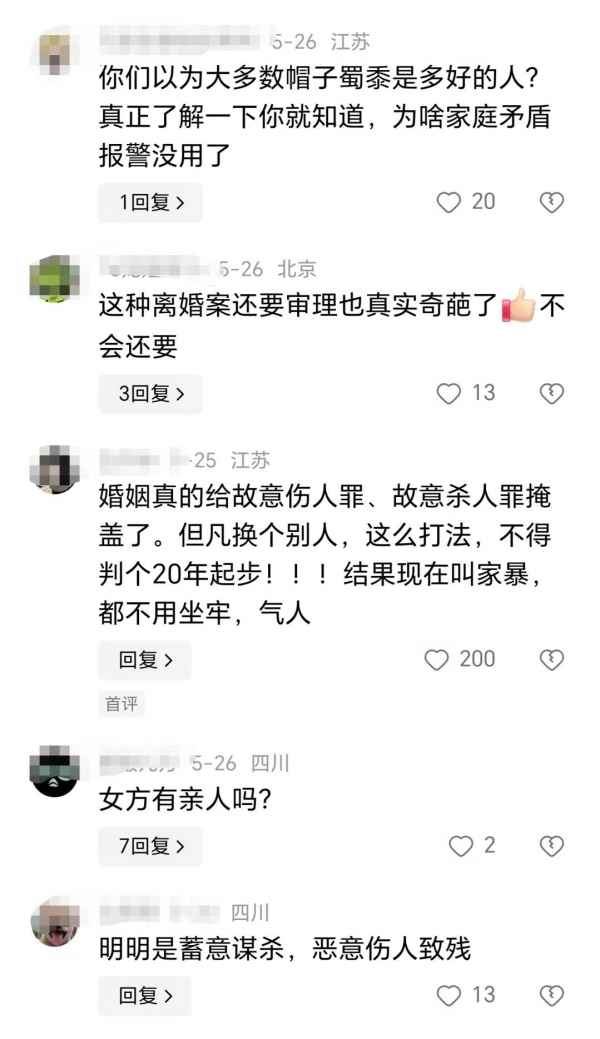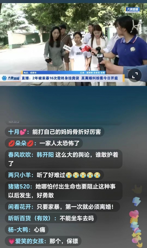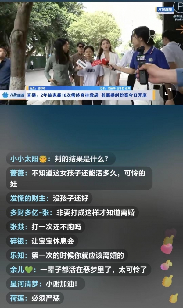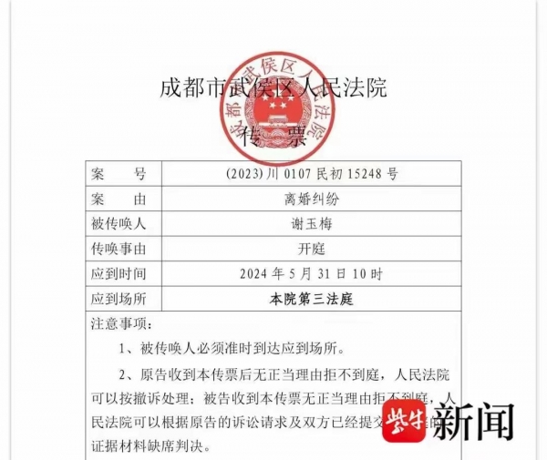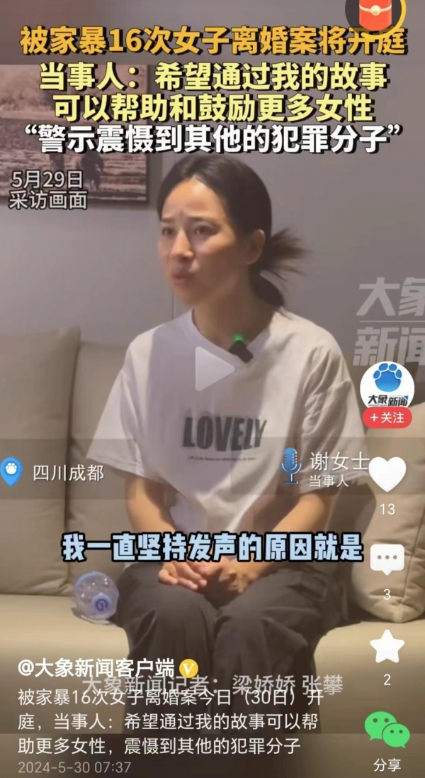 5月24日晚,谢女士收到了四川省成都市武侯区人民法院传票,案由写着"离婚诉讼"。收到传票那一刻,谢女士哭了。"离婚诉讼过后,意味着我马上就要自由了,要解脱了,但对我来说,现在离婚并不是最重要的事情,之后的刑事诉讼我希望重判贺某阳。"网友对这个案件非常关注,这是关于家庭中的严重家暴问题,能导致死亡一个案件。