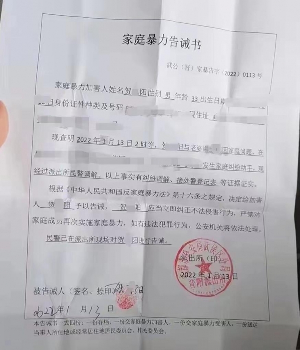 2023年4月15日,二人签署离婚协议,但贺某阳反悔。同年4月24日,谢女士向武侯区人民法院申请人身保护及离婚申请,但未被受理。4月25日凌晨,贺某阳找到谢女士实施最后一次施暴,导致其全身多处损伤。
