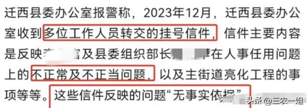根据经济观察网的报道,马树山市举报的县委书记和组织部长,因为用人和城市亮化方面存在着不当的问题,结果马树山的举报信部分被转到了当地县委办,2023年12月6号县委办以"无事实依据"为由报警了!
