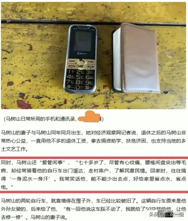 马树山作为迁西好人,从退休之后回到家中,没有追求所谓的安逸享乐的生活,也更没有享受天伦之乐!在马树山退休之后回到家的15年的时间里,骑着自行车,用着老年手机和破旧的通讯记录本,走村入户调查民情民意。