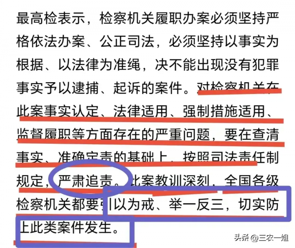 最高检察长表示,"对检察机关在此案(即马树山案)事实认定、法律适用、强制措施适用、监督履职等方面存在的严重问题,要在查清事实、准确定责的基础上,按照司法责任制规定,严肃追责!"