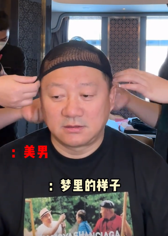 首先,博主先给广坤叔带上了发网,准备给他挑一个帅气的假发戴上,毕竟小鲜肉的发量可不能那么稀疏。