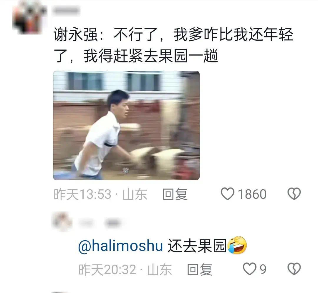 "谢永强:不行了,我爹咋比我还年轻了,我得赶紧去果园一趟。"