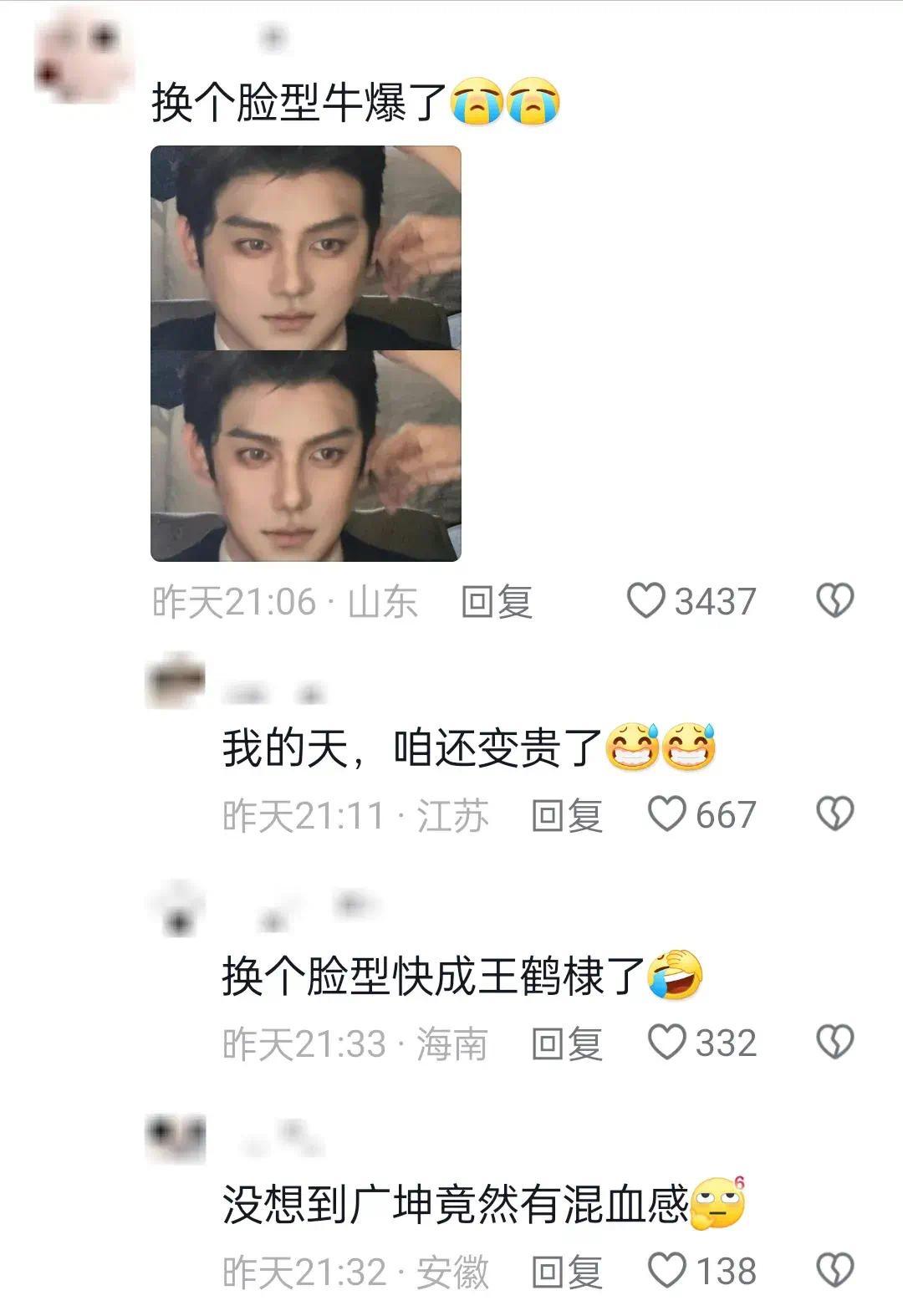 有网友给广坤叔的脸型P了一下,换了一个脸型的广坤叔真的是帅爆了,只能说化妆师的技术真的太牛了!
