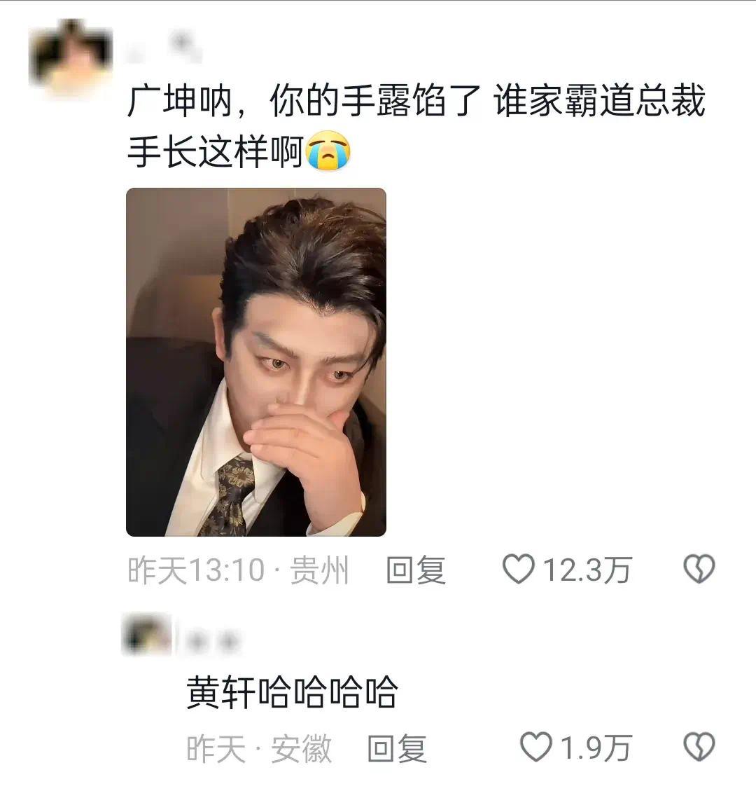 广坤叔的小胖手跟自己帅气的脸完全不搭噶,直接让大家从梦里醒过来了,毕竟谁家的霸道总裁长个小胖手啊: