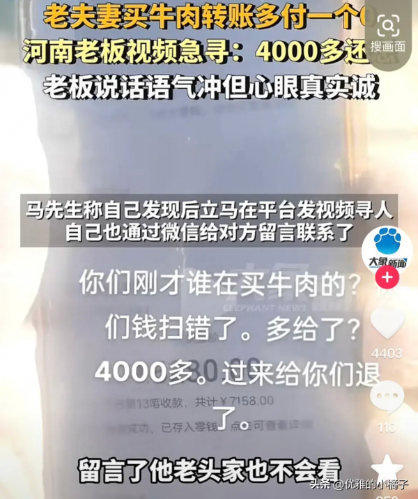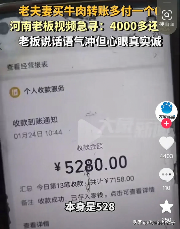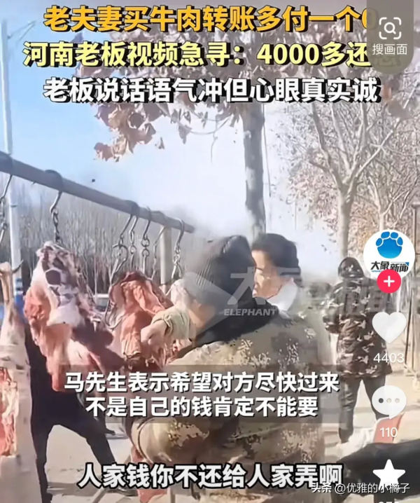 这一事件发生在一家小肉铺,老年夫妇前来购买牛肉。由于不慎多打了一个零,他们转账付了5280元,远远超过了商品的价格。店主马老板收到款项后发现错误,他立即决定要退还多余的钱款给顾客。他通过各种渠道,包括社交媒体,发布消息寻找顾客。