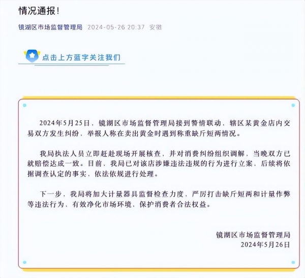 2024年5月25日,镜湖区市场监督管理局接到警情联动,辖区某黄金店内交易双方发生纠纷,举报人称在卖出黄金时遇到称重缺斤短两情况。