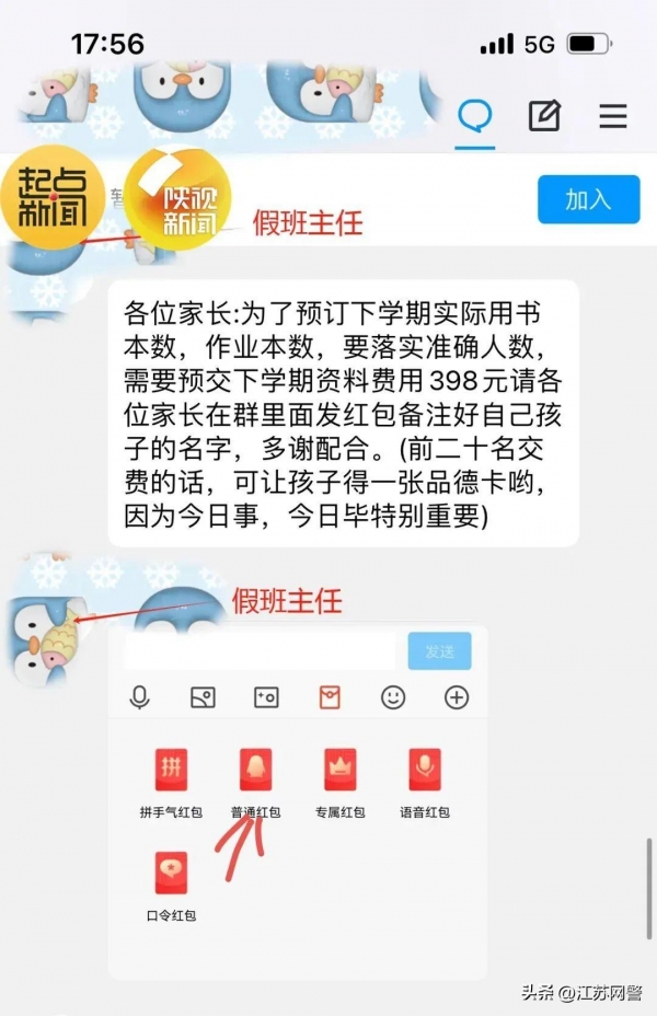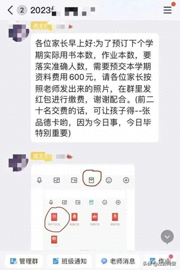 1月12日下午,某小学突然有一名自称"班主任"的人在家长群里发布缴费通知:"为了预订下学期实际用书本数,作业本数,要落实准确人数,需要预交下学期资料费用398元,请各位家长在群里面发红包备注好自己孩子的名字,多谢配合。"