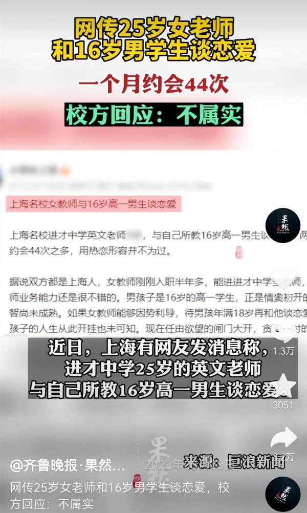 还有网友说2023年也有人曝上海的一名25岁女老师和16岁男学生谈恋爱,一个月约会44次,最后被证实是有人恶意造谣。