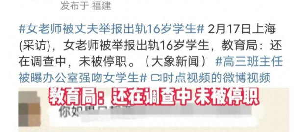 近日,上海一名女教师被丈夫曝出涉嫌与一名16岁的学生有不正当关系。这一消息引起了广泛关注和担忧,教育局紧急介入,表示已经暂停该女教师的教学工作,并展开调查。