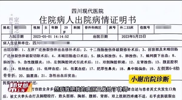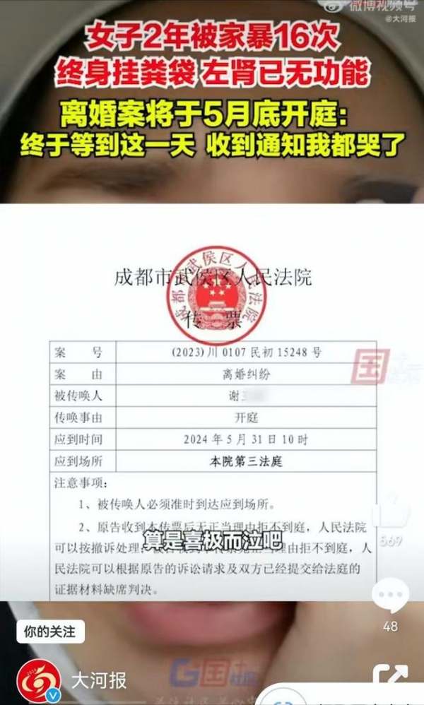 2024年5月30日报道,2年被家暴16次的四川女子小谢,丈夫将她打到终身需挂粪袋,身上21处骨折后,他们夫妻间的离婚案,终于迎来了开庭。